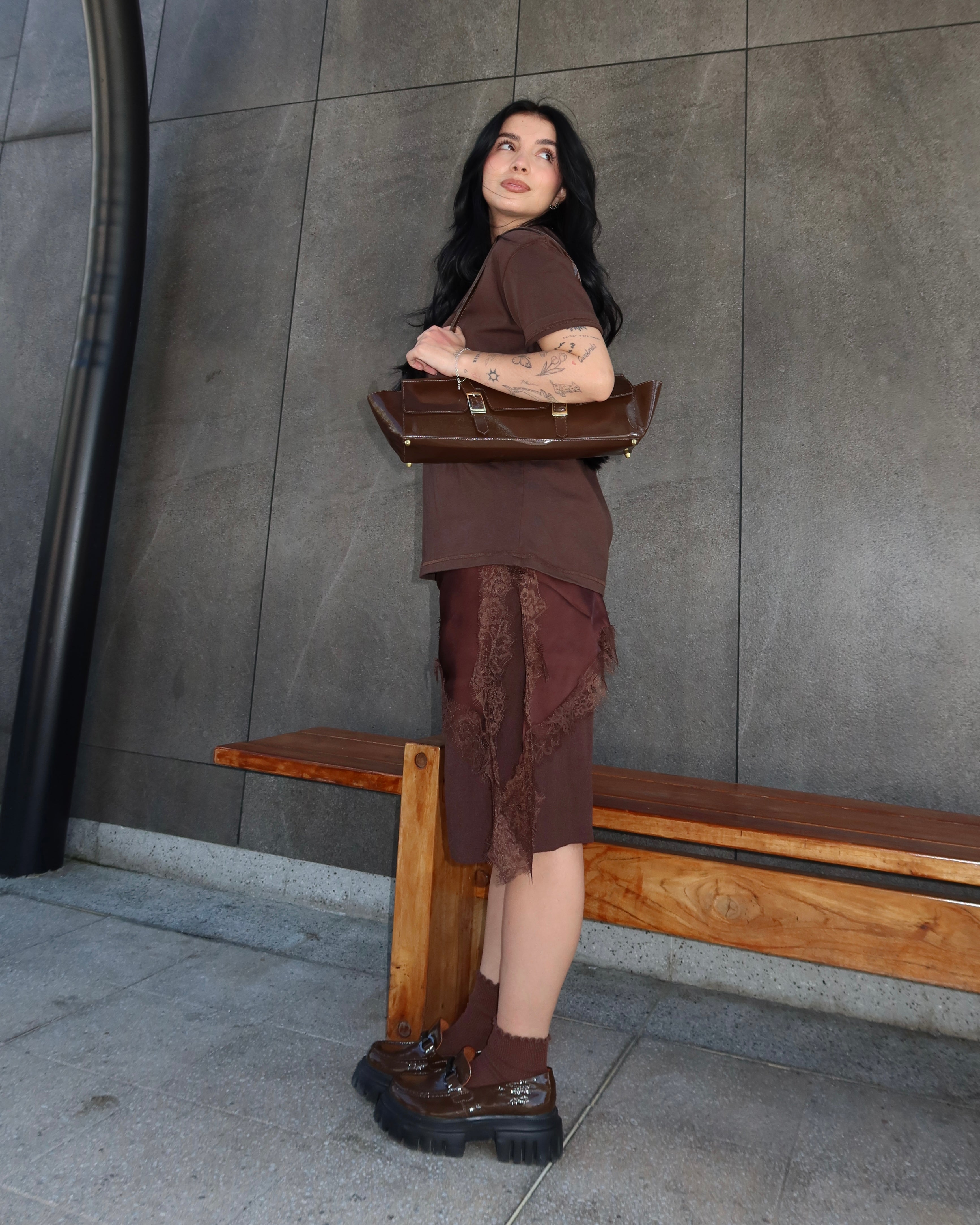Loafers fabricados completamente en cuero genuino chocolate brillante tipo charol, Con Suela tractorada negra y herrajes en Samak inoxidables
