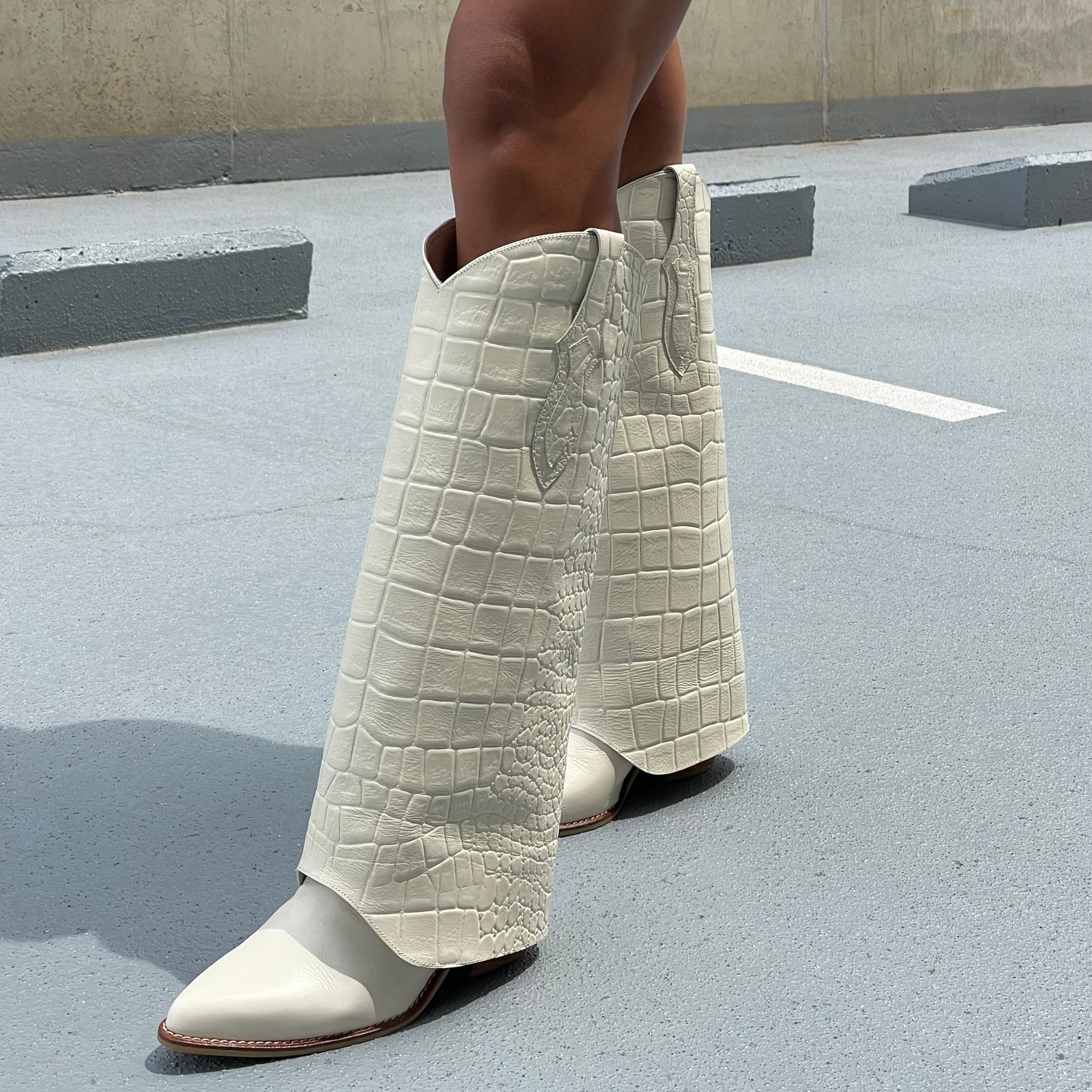 PantsBoots Vaqueras, fabricadas 100%en cuero con diferentes texturas, tacón texano en madera de 5cm de altura y caña larga hasta la rodilla
