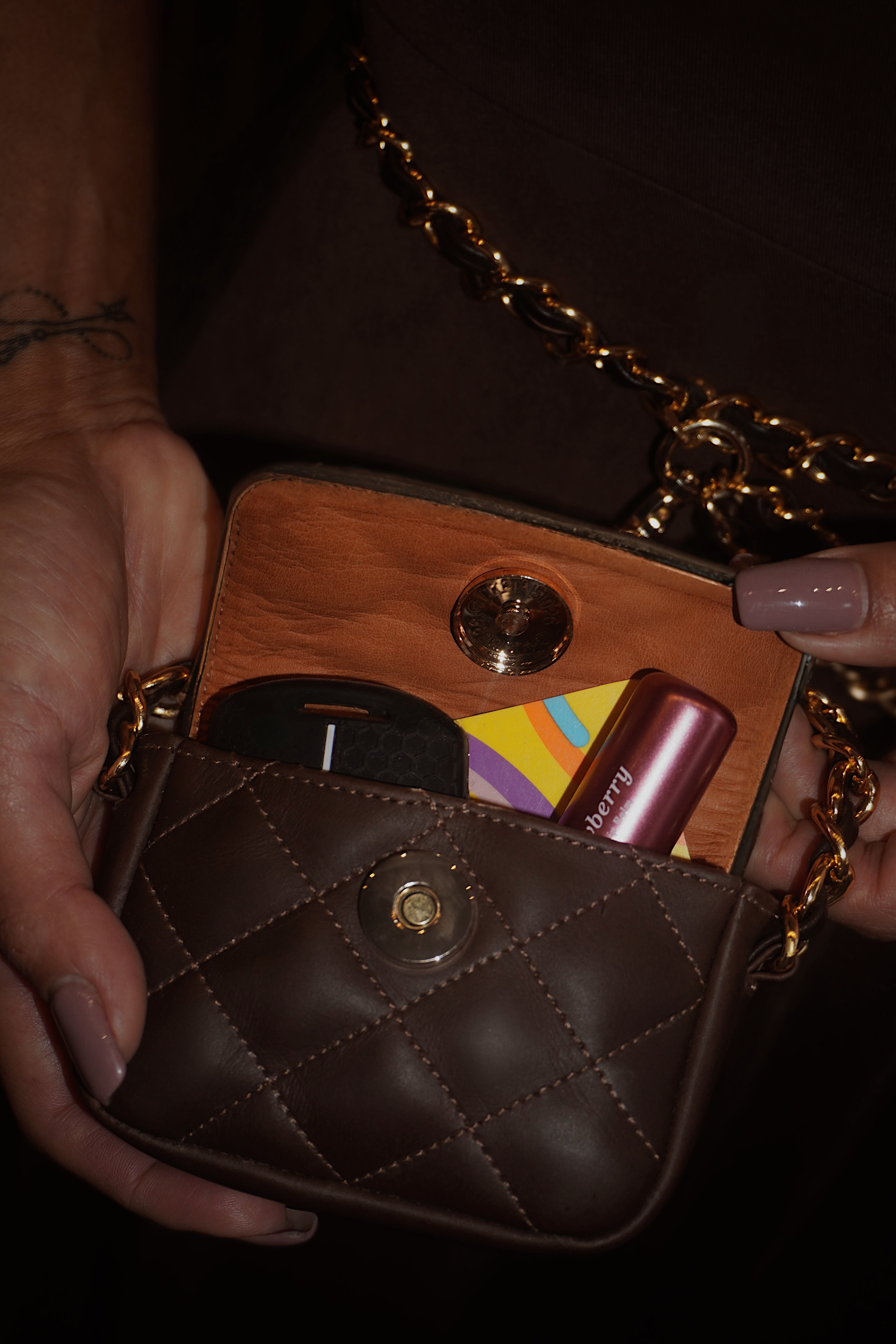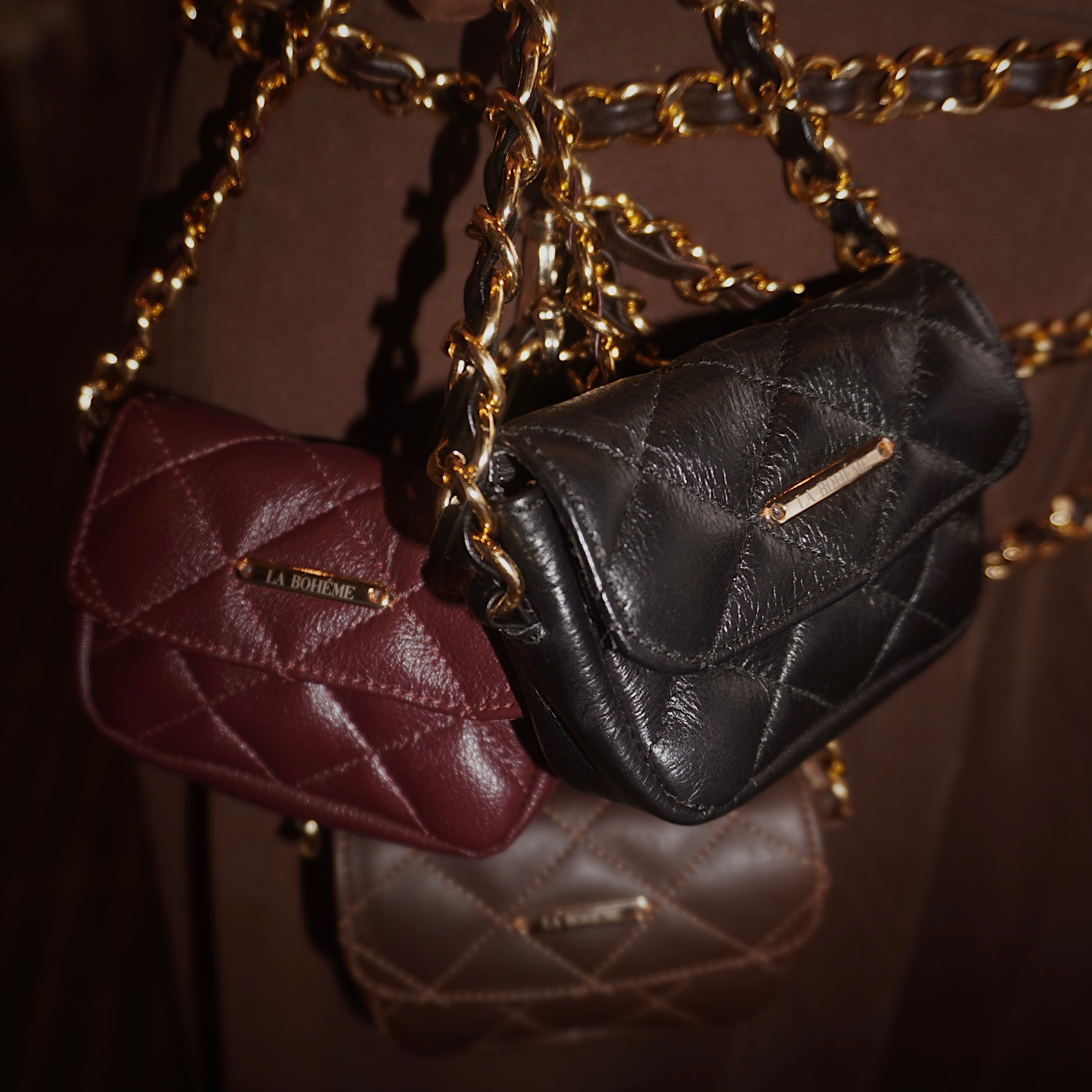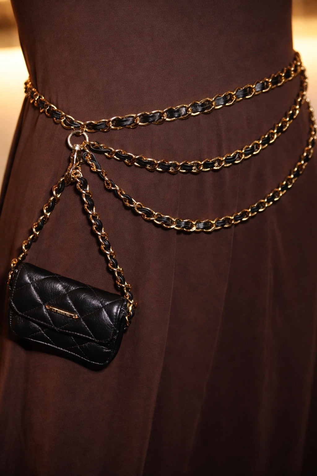Cinturón con charm mini bag completamente fabricado en cuero bovino, con herrajes en samak, en negro, marrón y burgundy